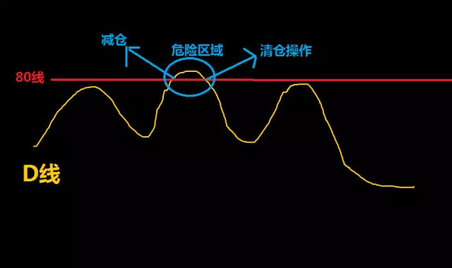 当指标D一路上涨,突破80时,指标即进入超卖区域。该形态说明多方力量强烈到了极点,如果后续力量不足,将会有反转下跌的危险,微信公众号搜索:K线密码,关注免费学习更多K线知识。看到这个信号,投资者应该卖出部分股票,而如果在D线向上突破80时,成交量也出现萎缩,说明多方力量已经开始衰弱,一旦D线再次回头跌破80,最好清仓出局。