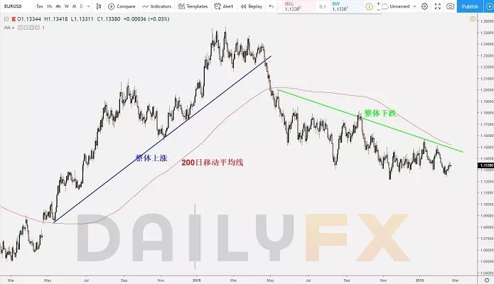 举个例子,如上图的欧元/美元日图所示,当守在200日移动平均线上方时,欧元/美元整体维持上涨的趋势,此时确认有效突破後则可考虑看涨策略、顺势伺机买入;而当欧元/美元下破200日移动平均线後,汇价整体走势则呈下行,此时在确认有效跌破後便可伺机逢高做空。