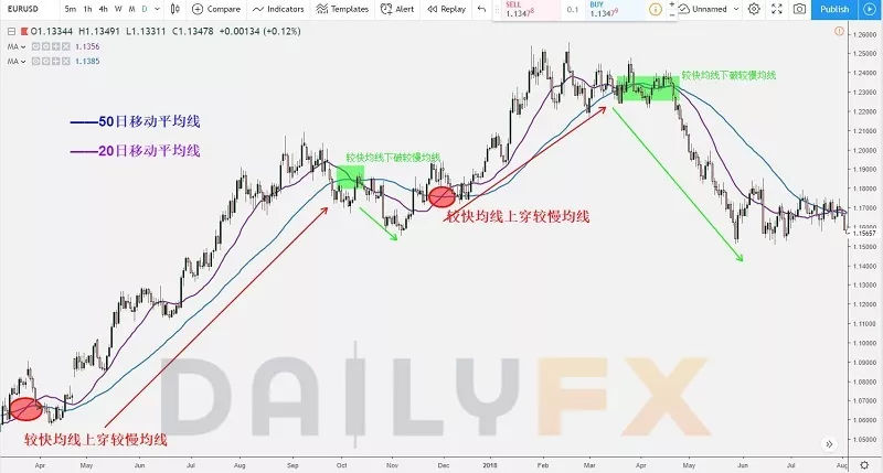 举个例子,如下图所示,我们在欧元/美元的日线图上添加了20日移动平均线(较快的移动平均线)和50日移动平均线,当20日移动平均线有效上穿了50日移动平均线後,虽然汇价先是延续了此前的下跌势头、继续小幅下跌,但随後便在低位寻得了支撑展开了反弹回升势头。在此背景下,确认有效上破後便可在适当的时机入场做多欧元/美元;反之,当20日移动均线下破50日移动平均线时,欧元/美元便开始回落走低,在确认有效跌破後,便可伺机逢高入场做空欧元/美元。