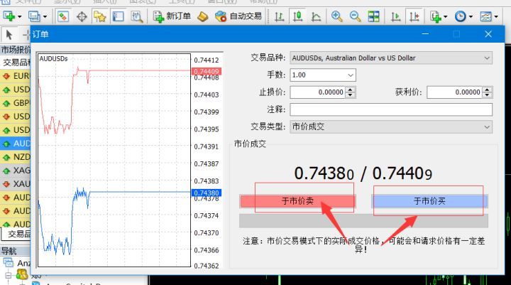 如上图,选择好你要外汇交易的手数,并设置好止赢损(这里也可以在成交以后再设置)。如果是做多,就点击与市价买;如果是做空,就点击于市价卖。