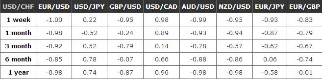 看一看下面的表格。每个表格反映了主要货币对和其他货币对在不同时间段内的相关性。