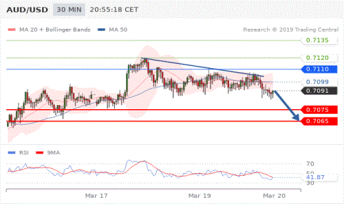 交易策略: 在 0.7110 之下,看跌,目标价位为 0.7075 ,然后为 0.7065 。