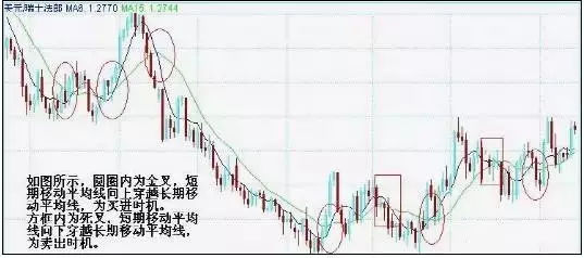 这时快线从下向上突破慢线是买入信号,称为:“金叉”;如果快线从上向下跌穿过慢线是卖出信号,称为“死叉”,则应该认为市场开始回落,投资者应该及时获利了结。