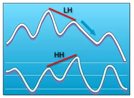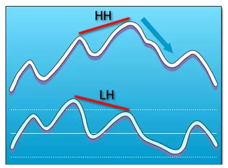 现在,如果汇价形成一个更高的高点(HH),但是震荡指标却形成一个更低的高点(LH),那么,我们就会看到常规空头背离的形成。