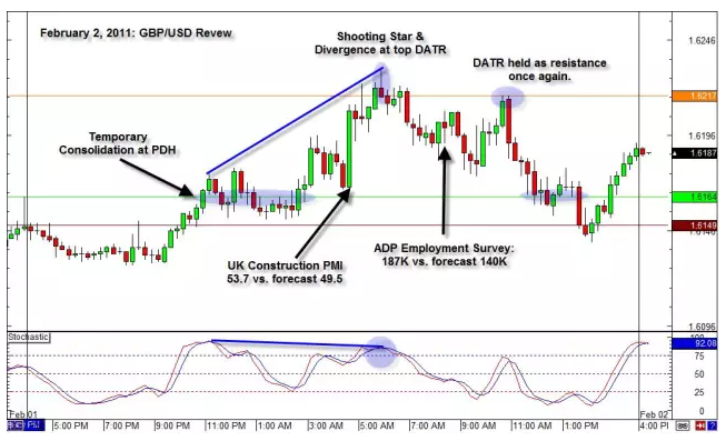 英镑/美元15分钟图显示,汇价起初经历短暂横盘整理,在好于预期的英国建筑业PMI数据公布后,汇价出现走高,射击之星以及顶背离形态出现,此后,英镑/美元总体呈现出下跌走势。