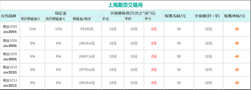 根据上海期货交易所的规定,黄金期货最低可交易一手,一手等于1000克。期货交易所规定的标准保证金和标准手续费如下表所示: