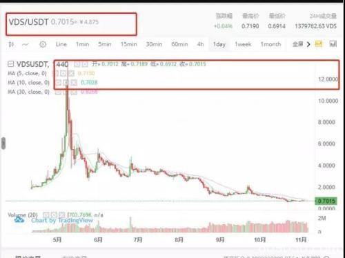 VDS在Biki上线之后经过短暂的猛涨,触及12美元高点后便急速下调。截至11月6日,VDS价格显示为0.7017美元(约人民币4.877元),累计跌幅最高达94%。