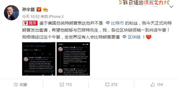 鉴于美国总统特朗普表达他并不是比特币的粉丝,我今天正式向特朗普发出邀请,希望他能够与巴菲特先生,我,各位区块链领袖一到共进午宴!我相信经过这个午宴,全世界没有人会比特朗普更懂。