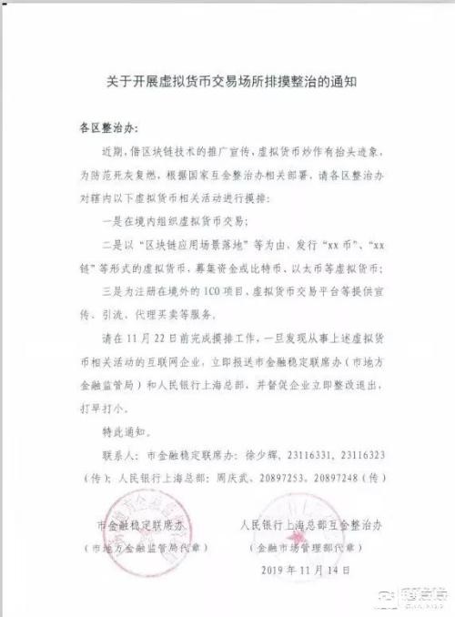 11月15日,在上海互金整治办的牵头下,上海市金融稳定联席办和中国人民银行上海总部联合印发《关于开展虚拟货币交易场所排摸整治的通知》(下称《通知》),开展对辖内虚拟货币交易所排摸整治。据财新网消息,央行上海总部相关人士表示,目前这项工作由上海市互金整治办牵头,央行配合,具体要求由上海市地方金融监督管理局负责。