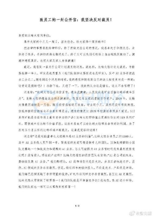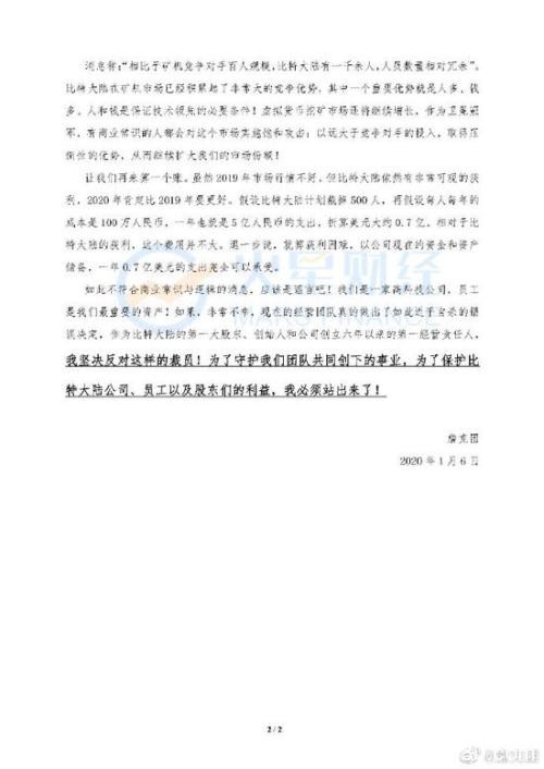 如此不符合商业常识与逻辑的消息,应该是谣言吧!我们是一家高科技公司,员工是我们最重要的资产!如果,非常不幸,现在的经营团队真的做出了如此近乎自杀的错误决定,作为比特大陆的第一大股东、创始人和公司创立六年以来的第一经菅责任人,我坚决反对这样的裁员!为了守护我们团队共同创下的事业,为了保护比特大陆公司、员工以及股东们的利益,我必须站出来了!