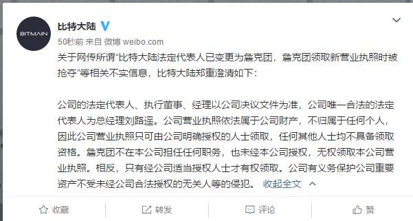 下午稍早时候,比特大陆就已发布声明称,目前,詹克团已不在“北京比特”担任任何职务。市场监管部门公示登记显示詹克团为我司法定代表人属于登记错误,且严重违反《公司法》的规定。刘路遥为“北京比特”现行合法有效的法定代表人。在此期间,詹克团冒充“北京比特”法定代表人违法从事的任何行为,我司均不予承认,并保留追究詹克团及相关方法律责任的权利。
