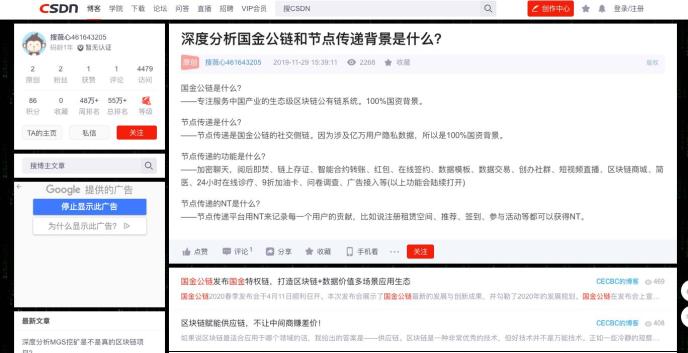 不仅宣传视频和部分网络推文,类似的宣传内容也出现在知乎、百度贴吧、CSDN等不少网络社区、交流平台上。在他们的宣传中,国金公链不仅属于国企,还作为“国务院发展研究中心的区块链产业应用重大课题”,并在中科院顶尖院士团队及国家工信部部委指导下,“打造中国自主权、商业模式、合法合规、具有国家战略发展意义的生态级区块链公链系统”。