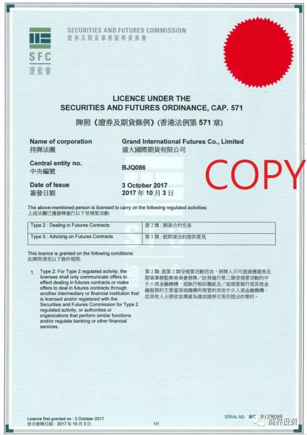 大国际期货有限公司获香港证券及期货事务监察委员会批准为持牌法团(证监会中央编号: BJQ086),从事第二类及第五类受规管活动,即期货合约交易及期货合约建议,主要为提供国际期货交易平台,主要从事商品期货经纪,金融期货经纪业务,特别关注国内投资者交易港股,香港恒生指数及期权,香港SASA指数期货及期权,海外期货交易所平台金融产品(如CBOE,CBOT,CME,ICE,LME等)为各类投资者提供安全便捷的金融服务。