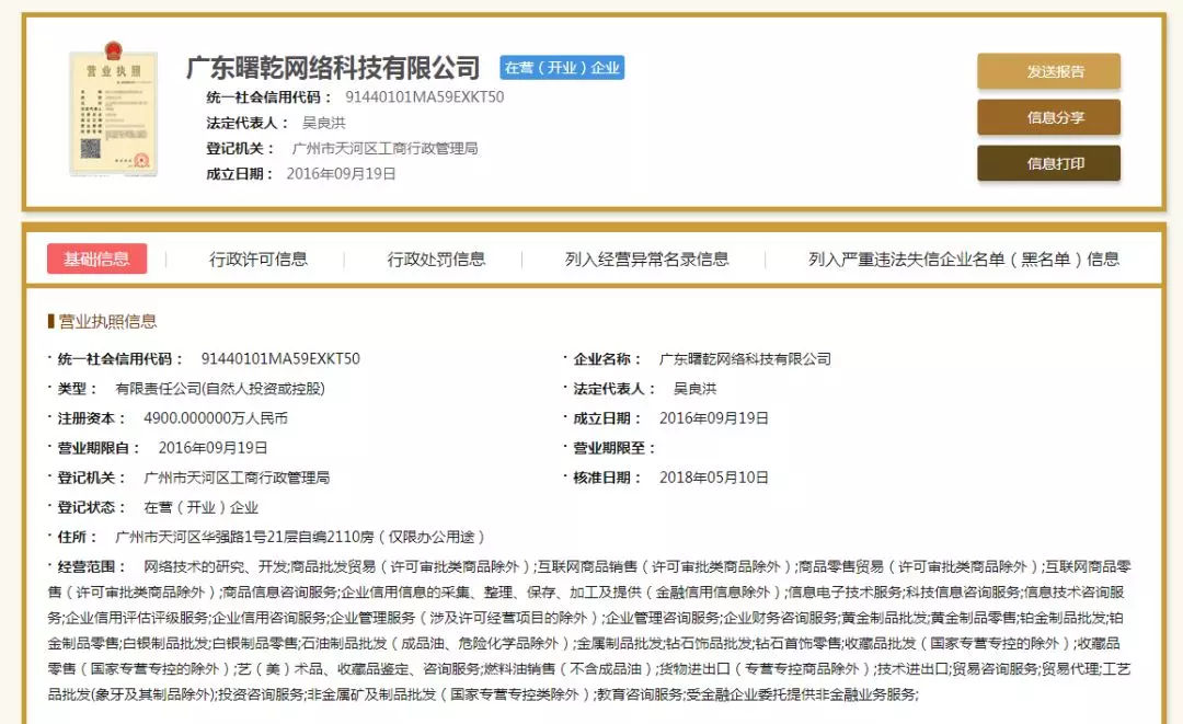 登录国家政府网站全国企业信用信息公示系统:http://gsxt.saic.gov.cn/ ——输入广东曙乾网络科技有限公司——搜索后就可以看到我们公司的在国家政府部门的备档信息了。