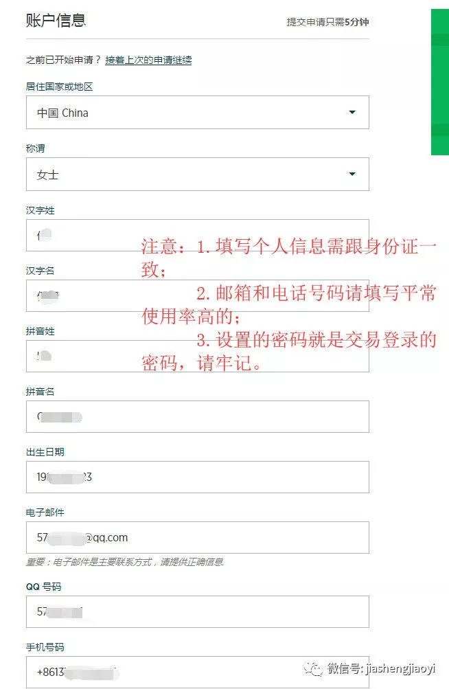 4.申请填写方法(如下图)电脑提交的也是相同方法,两种账户的填写内容大致一样,填写项目没有太大的差异。填写过程中做到无错字无漏字。保持与身份证(sfz)信息一致.填写密码一项就是您的交易密码,请务必记牢!