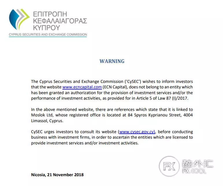 具体而言,CySEC警告称,www.ecncapital.com网站“不属于2017年第87(I)号法律第5条规定中有关提供投资服务和/或投资活动的授权实体”。