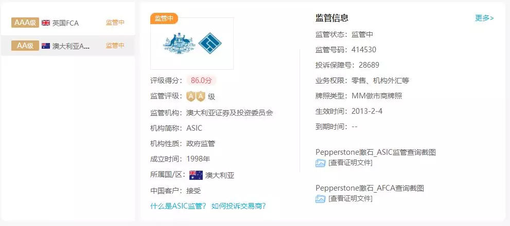 激石 (Pepperstone) 由澳大利亚证券投资委员会 (ASIC) 【监管号:414530】和英国金融行为管理局 (FCA) 监管【684312】。Pepperstone 持有澳大利亚证券和投资委员会 (ASIC) 颁发和监管的澳大利亚金融服务执照。Pepperstone 通过澳大利亚的银行保持客户帐户分离。Pepperstone 使用包括澳大利亚国民银行在内的澳大利亚金融机构为客户提供资金托管服务。以下为激石 (Pepperstone) 监管查询截图: