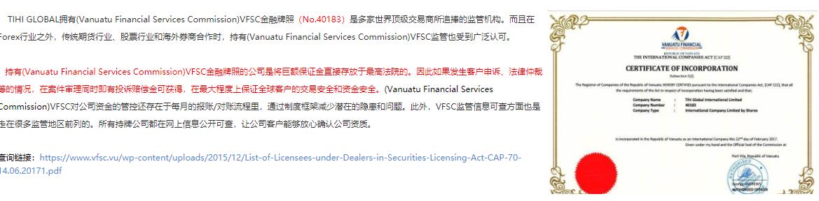 GLOBAL官网显示,GLOBAL全称是TIHI GLOBAL INVESTMENTS LIMITED,是一家隶属于英联邦的大型金融投资集团,主要提供国际化投资产品,在英联邦和香港等都友运营结构,拥有(Vanuatu Financial Services Commission)VFSC金融牌照(No.40183)