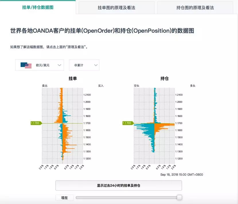 比如在「数据中心」板块, 想要了解使用方法的可以点击「使用方法」,想要了解数据的可以点击「查看数据」查看。以「挂单(OpenOrder)/持仓(OpenPosition)」图表为例,该图表能反映的世界各地OANDA客户的挂单和持仓的数据图。第一列「挂单/持仓数据图」,可以看到过去24小时挂单及持仓的具体数据。