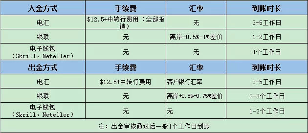 入金方式:银联、电汇、电子钱包(Skrill,Neteller);