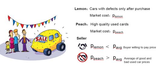 信任是如此的重要。因为没有信任,某些市场可能就此消失。在阿克洛夫1970年发表的论文《柠檬市场:质量的不确定性和市场机制》中提到,信息不对称会通过逆向选择带来市场的低效率。二手车市场也许会就此消失(图6)。由于有柠檬(质次二手车)的存在,买方会压低出价,梨子(质优二手车)由于市场价格低而退出市场,那么市场供给端内柠檬的比例上升,买方进一步压低出价,更多的梨子退出市场,从而形成恶性循环,直至二手车市场消失。