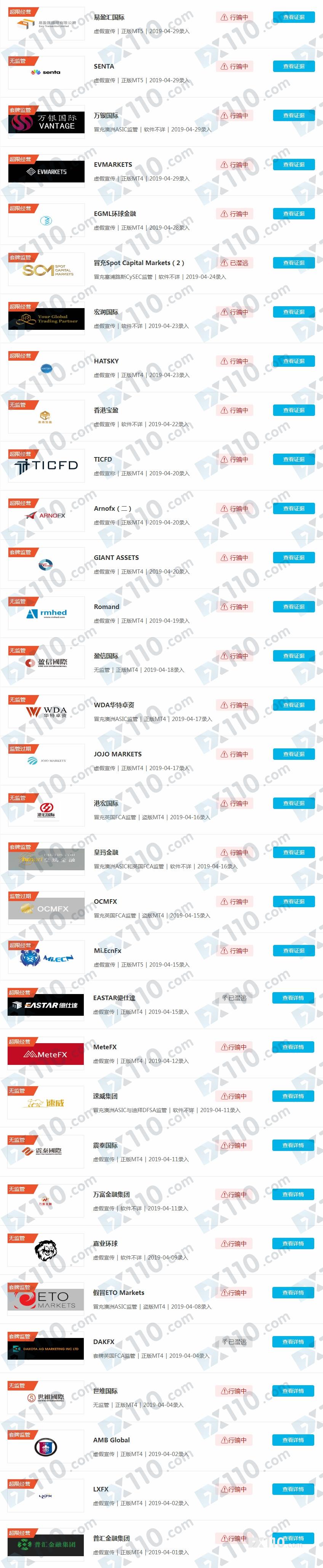 普汇金融集团、LXFX、AMB Global、世维国际、DAKFX、假冒ETO Markets、嘉业环球、万富金融集团、震泰国际、速威集团 、MeteFX、EASTAR億仕達、Mi.EcnFx、OCMFX、皇玛金融、港宏国际、WDA华特卓资、盈信国际、Romand、GIANT ASSETS、Arnofx(二)、TICFD、香港宝盈、HATSKY、宏润国际、冒充Spot Capital Markets(2)、EGML环球金融、EVMARKETS、万银国际、SENTA、易盈汇国际