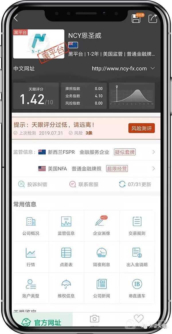 通过查询,NCY·恩圣威当前并无实际有效监管,存在巨大风险!查询可见,其宣称所持的新西兰FSPR监管的牌照号为575027的金融服务企业牌照,实为套牌;而美国NFA监管的牌照号为0522542的牌照类型为普通金融牌照,并无从事外汇经纪业务的权限,当前展业为超范围经营。