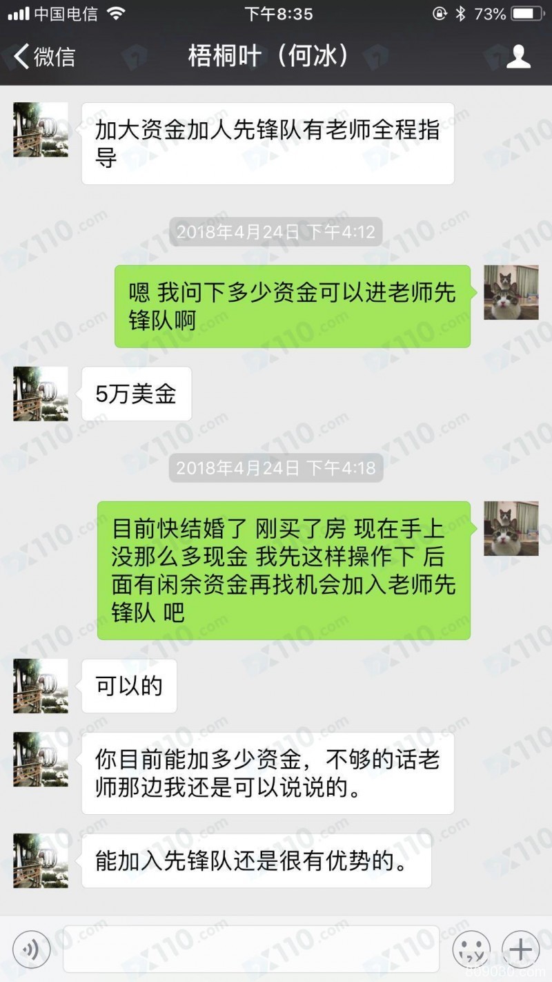老师让加齐蔓助理办理开户手续,开户要1万美金激活。做一手单子是1500美金,手续费150美金,买卖和平仓均收一个点差。上证指数波动一个点100美金。刚开始几天每天能赚个几百美金,没过几天老师树立了高大神一般的形象,就让大家下6-8成仓位,逆势做单。点数波动20个点以上也不让止损,说会反弹。结果就两天就赔掉所有的钱。