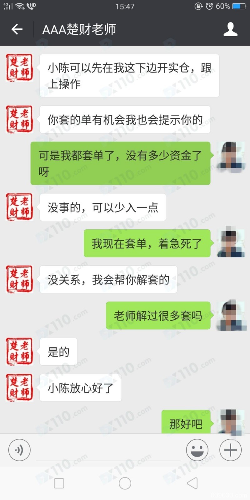 2018年6月,以一对一指导解套为由,微信号cc66358,自称楚财老师(自称姓刘)(QQ群365100309)要求在其名下开户操作并会指导我账户解套,故6月27日通过其发送的开户链接并指导进行开户注册及激活开户。一开始就叫对冲操作,频繁下单,后面套单损失越来越大,最后爆仓,损失近3万元。同时也没有实现前期约定的一对一喊单操作,也并未对我的另一个账号套单解套给与指导。