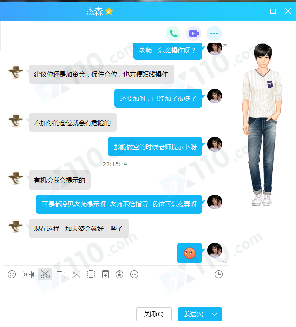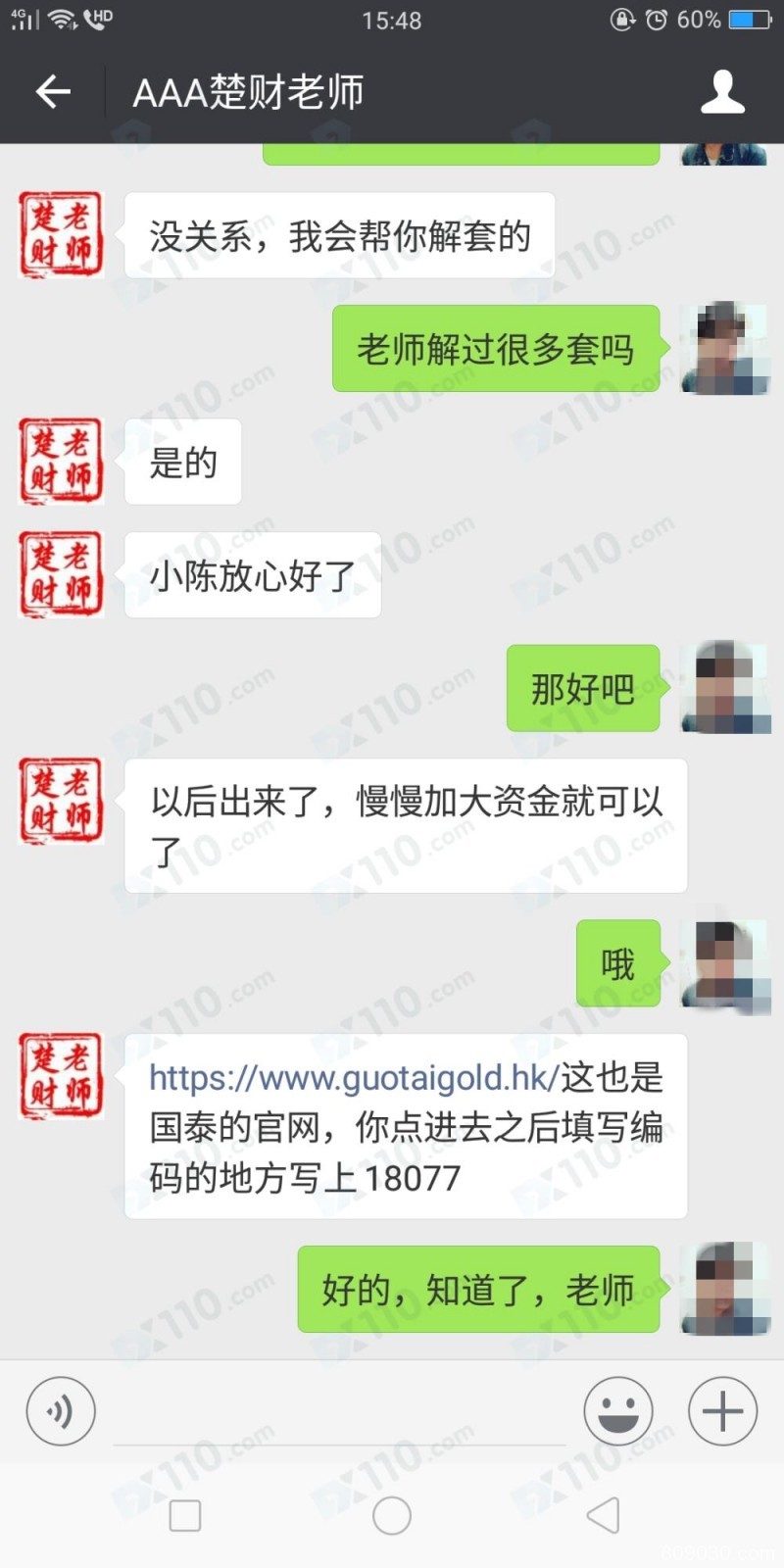 同期,2018年5月,被加入到QQ群391532388久盈高级分析指导群,(喊单老师QQ号:杰森2420899982,波师胜筹652697400,玉琪论金微信zyq1970622)进行一周的黄金喊单体验操作,并且群内几个网友(拖儿)多次联系,自称在其他平台亏损严重后,转入这个平台,老师喊单准确率高,不仅挽回了之前的损失,并且盈利颇丰等诱骗开户手段。本以为国泰的平台都是统一的,因前期已有国泰的账户,后被平台要求必须重新开户填写其代理商编码并且入金1万美金以上。因此于2018年5月29日经其助理(QQ3186473486)发送开户链接并指导注册开户。群上老师叫怎么操作我就怎么操作。6月15日大跌,咨询其中一位老师,没让锁仓,致使被套越来越深,可用资金越来越少,后期也不给与有效指导,导致资金一步步陷入进去,最后损失近20万元。现QQ群已将我踢出。