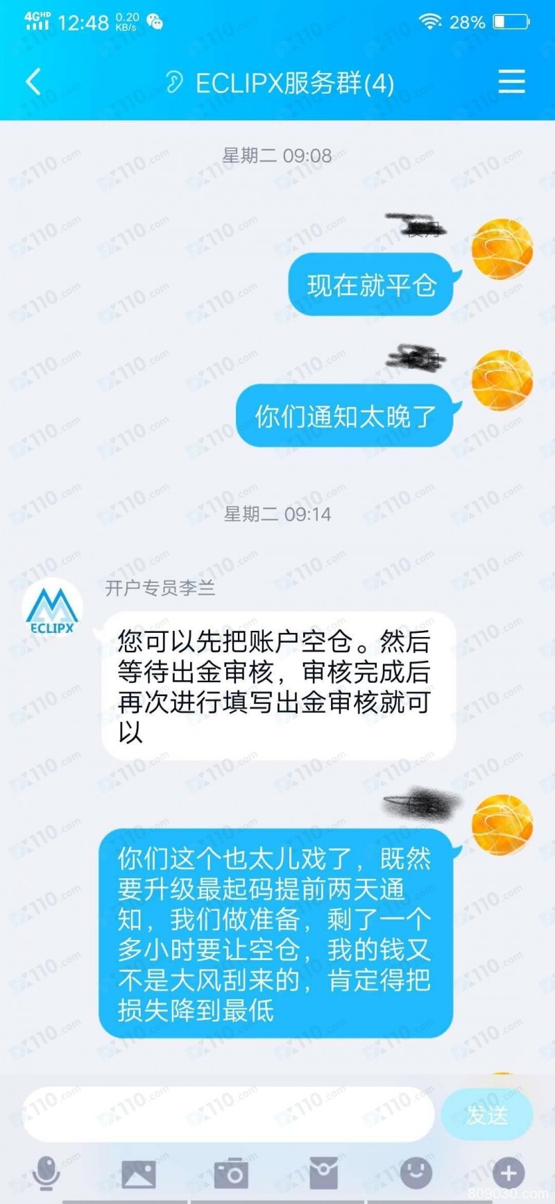 在6月10日晚上22点客服突然让我第二天空仓出金,理由是交易系统升级,当时白天我高位刚买入A50看空,如果在她规定时间内空仓出金会导致本金损失巨大,我把此情况告知客服,希望能多给几天时间让我处理仓位,可是客服态度坚硬,如果不按时出金告知我有任何损失责任自负