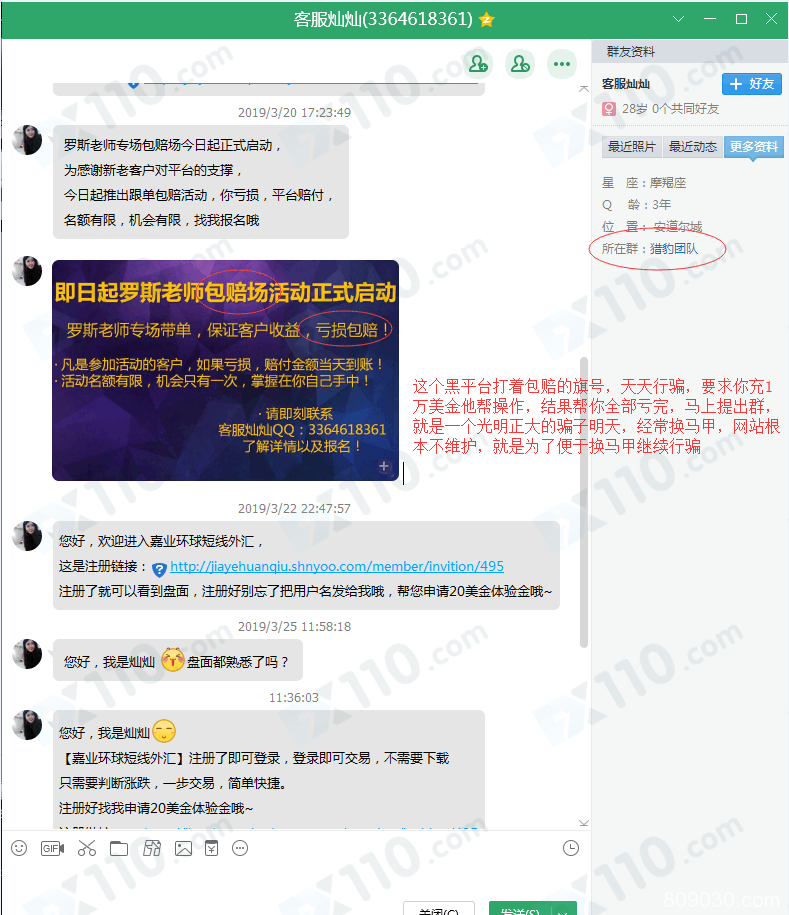 嘉业环球网站:http://jiayehuanqiu.shnyoo.comQQ群553481220名为“猎豹团队”是一窝骗子,大量拉人进群通过视频直播,打着包赚包赔的口号行骗,群里大部分是托。