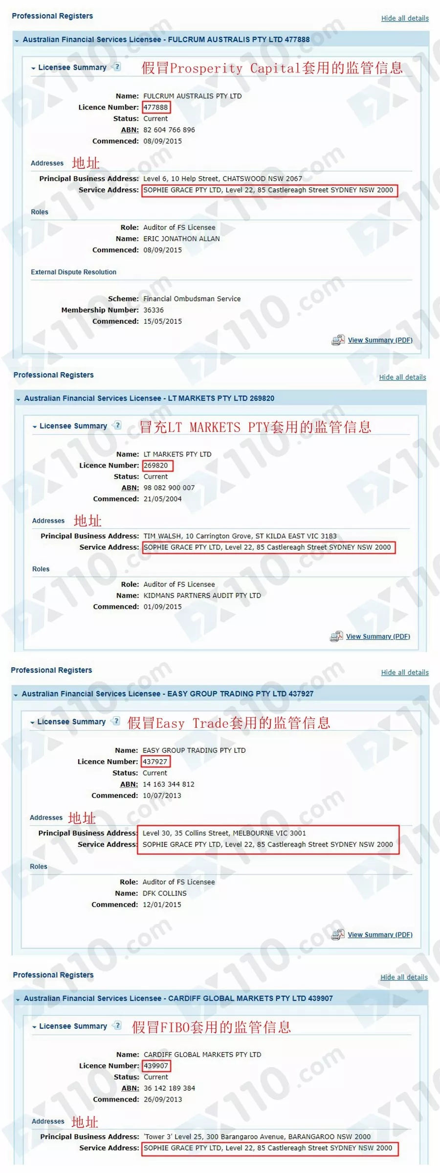 假冒Prosperity Capital、冒充LT MARKETS PTY、假冒Easy Trade、假冒FIBO这四个平台宣称的地址都是Castlereagh街85号22楼。