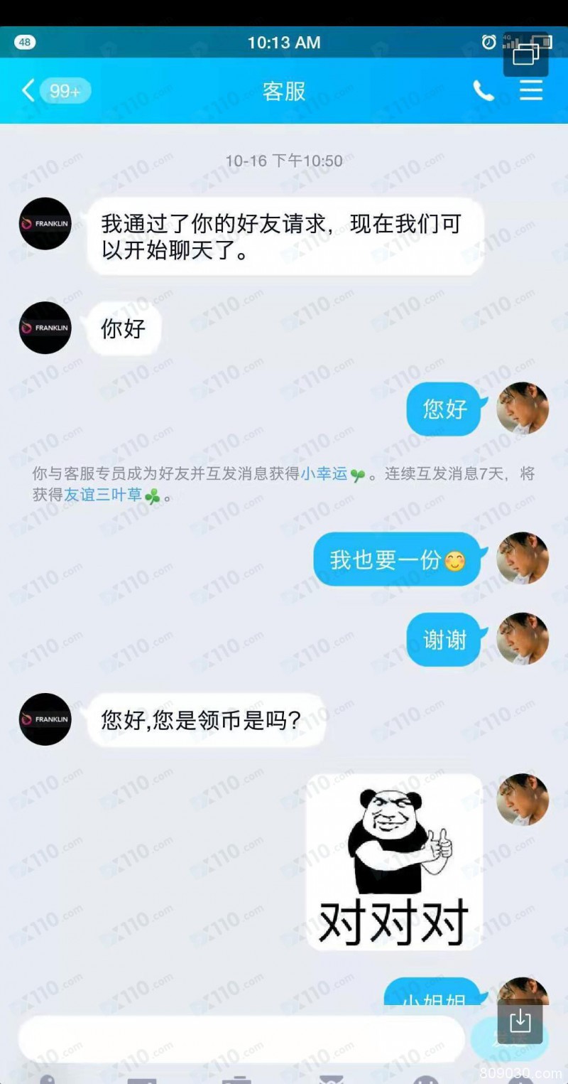 后期老师讲现在主板市场行情不好,风险还很大。慢慢地把我们向数字货币市场引导,协同几位老师讲这方面的课,如何高回报,如何扭亏为赢,相比主板市场的优势等等。接而推出了franklin数字货币交易平台,让发行方客服(总监微信号kubgh868688)加进来,通过免费送福利领100美元(币)诱导我们开户。正如老师预期,跟上老师节奏做二级市场交易的的确赚了,出金也没问题。老师讲有好消息,有新币股发行,鼓捣我们打新,不中不扣。15万才能申购,中了扣手续费,躺着赚金,把打新币股的成员又拉进了一个群。