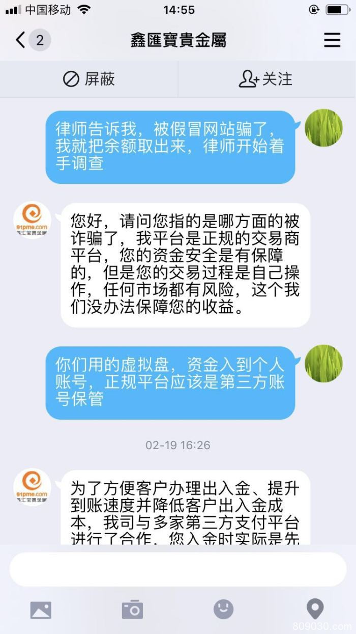 鑫汇宝贵金属:www.91pme.com2017年7月,一个偶然的机会,我在网上看到鑫汇宝贵金属公司的广告,抱着试试看的心理填写了个人基本信息,然后没过多久就收到一个自称来自香港叫小崔的客服的电话,介绍了公司的情况 ,我心动了,入金2000美元,开始炒金。按照平台授课老师的策略操作不断亏损近80万。