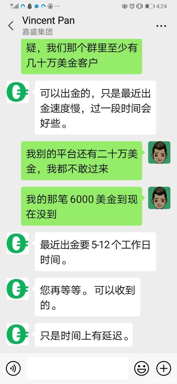 3月24号提现6000美金,截止4月9号,没有收到提款。在嘉盛平台3月24日,我的交易账户提交出金申请6000美金,mt4平台3月25日扣款,中途两次打客服4008428138电话,收的的答复是嘉盛方面处理取款的时间是2个工作日之内。取款资金离开嘉盛后,到达客户银行账户的时间因各个银行而异。银行方面的处理时间一般在1到12个工作日之内。
