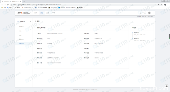 被网友拉入GTS平台做保本收益,1月19号入金5万美金承诺3个月保20%收益,4月份中旬我发现平台有问题,后面查询FX110网站上显示GTS是黑平台,我就想快点出金,刚好也快到期了。