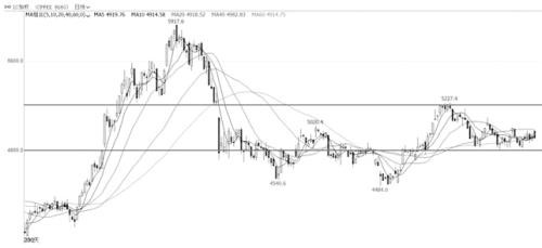 IC加权日线反弹至五一假期后的跳空缺口上沿附近遇阻回落,随后价格最低跌至4800点一线止跌企稳,但之后每次反弹的力量逐步减弱,反弹高度也依次降低。目前,中短期均线相互交织在一起,MACD指标的快慢线在零轴附近黏合在一起,均等待价格指引方向。综合来看,IC加权近期在4800点一线上方蓄势整理,反弹高度较为有限,市场需要等待新的力量来打破现有僵局。