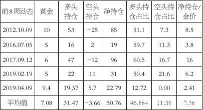 第三次零点:2018年6月21日,在黄金非商业净持多仓维持长期多头之后,非商业黄金多头持仓逼近年度新低,而非商业空头已经连续两个月上涨,市场的主力投资者已经开始转变风向。此时非商业多头持仓占比约为21.1%。此后非商业多头持仓振荡下跌而空头发力使得金价在2018年9月27日达到年内最极小值点,黄金非商业多头持仓依旧振荡下跌而空头持仓上涨,占比达到39.6%。2018年12月6日黄金净持仓再度由空转多,此时持仓占比约为22.4%,持仓量约为90008手,黄金价格加速上涨。