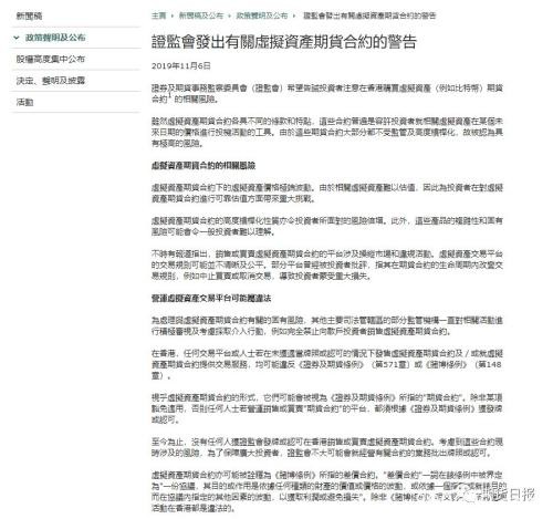 11月6日,香港证监会发出有关虚拟资产期货合约的警告,告诫投资者注意在香港购买虚拟资产(例如比特币)期货合约的相关风险。