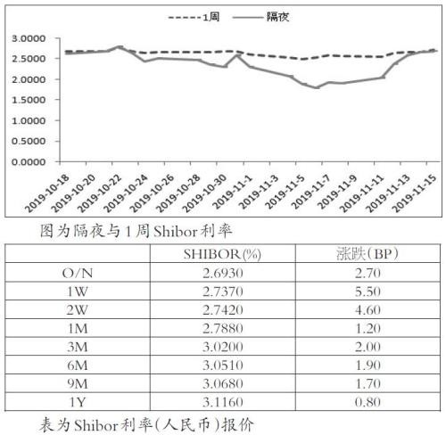 11月15日,所有期限的Shibor全部上涨。隔夜、1周、2周、1个月、3个月、6个月、9个月、1年期Shibor分别上涨2.70、5.50、4.60、1.20、2.00、1.90、1.70、0.80个基点,分别报收2.6930%、2.7370%、2.7420%、2.7880%、3.0200%、3.0510%、3.0680%、3.1160%。