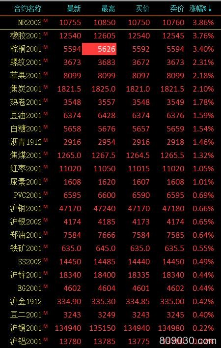 金融界期货11月20日讯 国内期货市场早盘收盘,商品期货多数上涨,黑色系多数上涨,20号胶、橡胶盘中快速拉升,20号胶一度涨超4%,最高至10850元/吨创上市以来新高,橡胶、棕榈油涨超3%。其他主力合约,螺纹、苹果、焦炭涨超2%,热卷、豆油、白糖、焦煤等涨超1%;原油跌逾1%。
