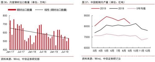 海外需求不佳,出口下滑或将对国内供需格局构成压力。2019年1-9月我国粗钢产量累计同比增长8.4%,同期钢材出口量下滑5%且下滑趋势大概率仍将延续,一升一降下2020年国内钢铁供给压力或将继续增加,整体价格也将继续承压。