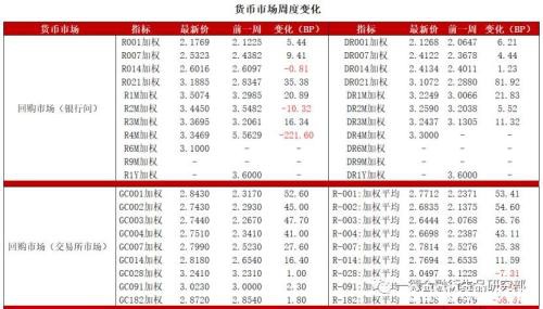 二、资金面上周资金面延续宽松。央行暂停公开市场操作,14日有2860亿MLF到期并未续作。截止周五收盘R001加权平均利率收于2.18%(+5BP),R007加权平均利率收于2.53%(+9BP)。DR001加权平均利率收于2.13%(+6BP),DR007加权平均利率收于2.41%(+4BP)。上周1个月期限拆借回购利率明显上升,后期关注跨年资金面变化。