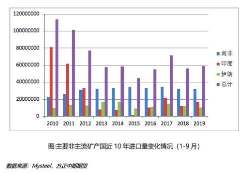 非主流矿中值得一提的是印度粉,印度一度是世界第三大铁矿出口国,但是从2010年开始,印度政府出于保护本国钢铁行业发展的目的对矿石开采的政策开始趋于严厉并上调了出口关税,致使出口量出现大幅萎缩,我国对其的进口数量也出现明显下滑,至2015年该值降到最低点。从2016年开始,印度政府对铁矿石开采和出口政策开始趋于宽松,出口到中国的数量逐步回升,但在2018年再度出现明显下滑,主要是因为作为印度粉的最大出口国,去年我国由于钢厂利润高企和环保的影响对高品矿更加青睐,对印度出口的58%以下的低品粉矿需求有出现明显减弱,使得印度2019财年铁矿出口量同比下降57%达到3年来最低点。2019年,国际铁矿供应出现明显的缺口,价格更是连续刷新近5年最高值,降成本成了国内钢厂的首要目标,目光重新转向了价格低廉的印度品粉矿。据Mysteel调研统计,今年1-10月份印度出口至中国铁矿石总量为1888万吨,同比增加50%;其1-10月份出口总量为达2511万吨,同比增加62%,全年出口量大概率重返近5年高位。