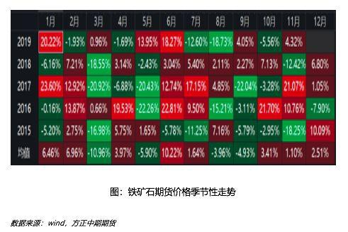 从近十年的普氏指数走势和近5年的铁矿石期货价格走势来看,铁矿价格全年涨幅最显著的时间段通常是在年初和6月份,走势最弱的时间段基本集中在3月份和三季度。这主要是因为一季度通常是外矿一年中的发运淡季,到港压力相对较小,而春节之前钢厂通常对原料端进行冬储,使得该时间段内铁矿整体供需较强。在3月份,下游开工尚未完全启动,钢厂由于节前进行了储备短期也无集中采购意愿,铁矿库存压力处于全年最高位,故其价格走势往往是一年中最弱的。4,5月通常是下游开工旺季,钢厂对铁矿的消耗量位于全年峰值,经过2个月的高消耗后铁矿整体库存会出现快速下降,故6月钢厂大概率会进行一轮集中补库以维持其旺季的开工。进入三季度后,由于天气炎热下游施工受限,成材消费转入淡季,钢厂的整体开工率将有所下降,对原料端的需求也会出现相应的减少,铁矿价格在该时间段通常呈现出下降走势。