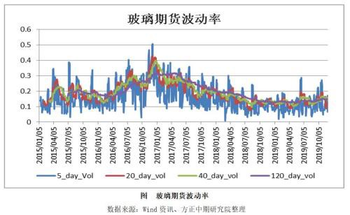 玻璃期货波动率(对数)自2017年以后趋于稳定。5日年化波动率来看,2015年以来80%的概率在7.6%-28.3%之间,近三年来80%的概率在7.4%-27.0%之间,近一年来80%的概率在6.3%-17.2%之间;20日年化波动率来看,2015年以来80%的概率在11.7%-27.1%之间,近三年来80%的概率在11.4%-27.1%之间,近一年来80%的概率在10.6%-17.4%之间;40日年化波动率来看,2015年以来80%的概率在12.3%-27.7%之间,近三年来80%的概率在12.1%-27.7%之间,近一年来80%的概率在11.7%-15.9%之间;120日年化波动率来看,2015年以来80%的概率在13.1%-30.3%之间,近三年来80%的概率在12.9%-30.8%之间,近一年来80%的概率在12.7%-14.7%之间。