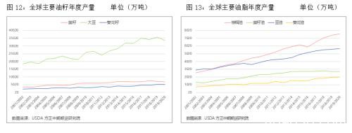 全球大豆的供给中心仍在美国、巴西和阿根廷三个国家,他们的大豆产量关系着每年全球大豆的价格涨浮,继而影响到全球豆油价格的走势,由于大豆的绝对产量较高,使得豆油的走势对其他油脂价格也带来较多的冲击。