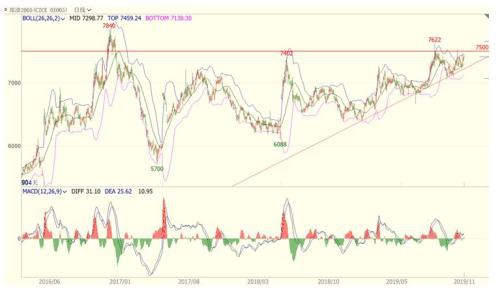 相对而言,菜油价格向上的动能仍旧偏弱,短期阻力位在7500元/吨的位置。由于菜油受中美贸易进程的影响较多,市场消息的发布可能会引起短期内盘面剧烈的波动,价格走势的趋势性没有豆油和棕榈油更为连贯。但是由于棕榈油价格的上涨会提升整体油脂的底部,因此菜油价格也将保持震荡上行的节奏不断筑升价格的底部。