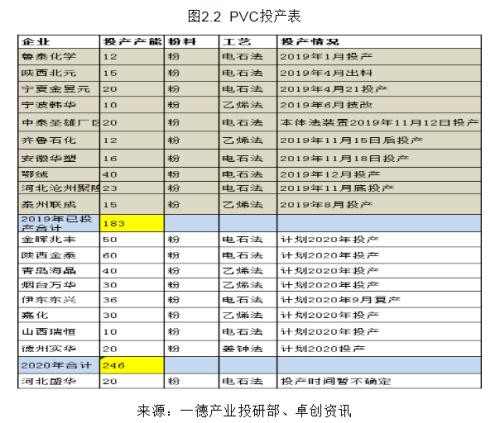 2020年PVC投产增加,需求端看,房地产数据和基建数据企稳向好,需求较2019年走好,但供应增速过大,下半年或会出现供需偏宽松格局。下半年开始,库存增库明显。电石有投产计划,在不投产情况下,提高自身开工率,仍会满足PVC新增需求。